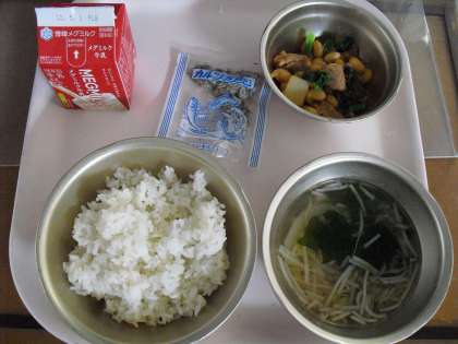 今日の献立は、麦ごはん、牛乳、肉みそいため、わかめスープ、じゃこでした。