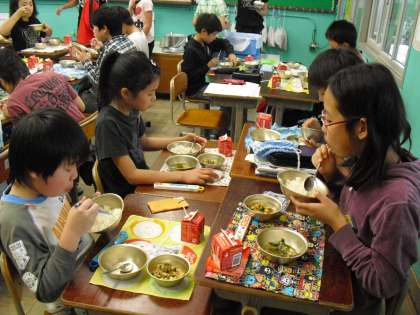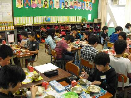 肉みそいためには、大豆もたっぷりと入っていましたが、とてもおいしい味つけにどのクラスも残さず全部いただきました。