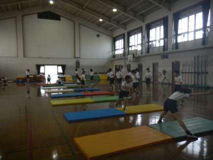 体育ではマット運動の学習が始まりました。ねらい1では、今できる技をつなげたり組み合わせたりして、連続技に取り組みます。指先までぴんとのばして、ひとつひとつの技が美しく見えるようがんばっています。
