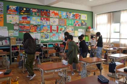 計画委員と各クラスの代表委員企画の「金ピカそうじ〜だまてそうじするDAY〜」が今日から始まりました。指定された金曜日は、学校を金ピカにするために、おしゃべりをせずにそうじに取り組みます。しいんと静まりかえった学校で、子どもたちが黙々とそうじに取り組むと、いつもよりも早く学校中がきれいになりました。5時間目に、「なんか気持ちがいいなあ」と話している子たちもいました。学校が今よりももっと金ピカになるよう、全校生でがんばっていきたいと思います。