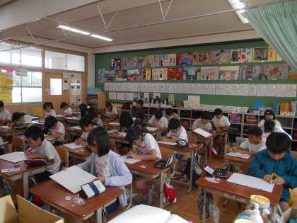 図画工作科の「ほってすって見つけて」の学習で、彫刻刀の使い方を知り、実際に練習をしました。初めての彫刻刀に、わくわくした表情で集中して取り組んでいました。使い方に気をつけながら、安全に、作品を作っていってほしいと思います。