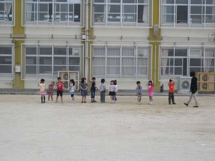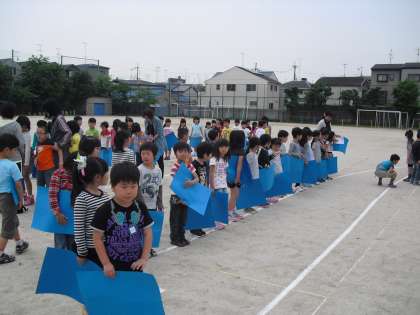 今日は創立140周年を記念して、航空写真の撮影がありました。みんなで青い画用紙をもって並び、人文字をつくります。