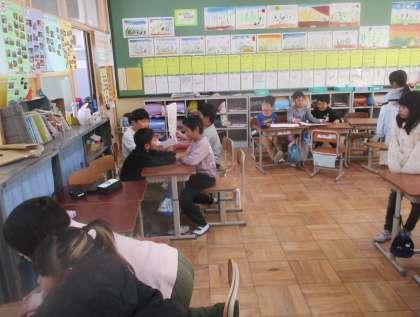 生活科「もっともっとまちたんけん」の学習で、川岡の町にあるお店や施設にインタビューに行き、そこで学んだことをみんなに伝えるために、発表会をしました。子どもたちは、クイズや新聞、ペープサートや紙芝居など、様々な手段で発表していました。