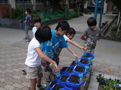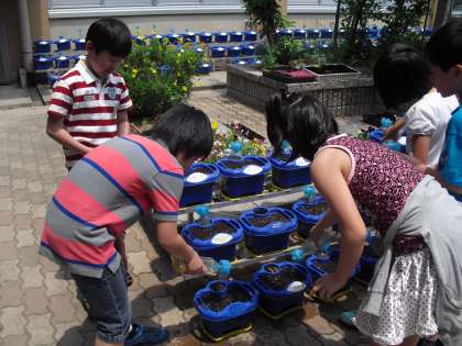 理科の時間にヒマワリの種をまきました。グループのみんなで協力しながら、ひとつひとつ愛情をこめてまいていきました。先日まいたホウセンカの種にもしっかり水をやっています。早く花を咲かせないかなぁ。