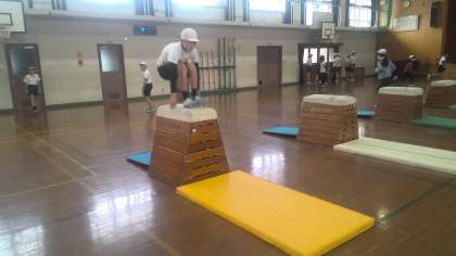 思いっきり踏み切って、バンッ!!しっかりと手を跳び箱について、着地もピタッととまれるように意識して跳び越そうと意欲的に励んでいます。今後もできる技をより美しく、できるようになりたい技にも挑戦していきましょう。