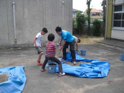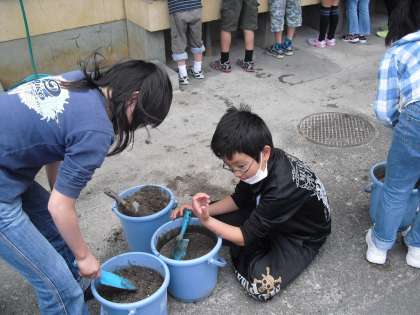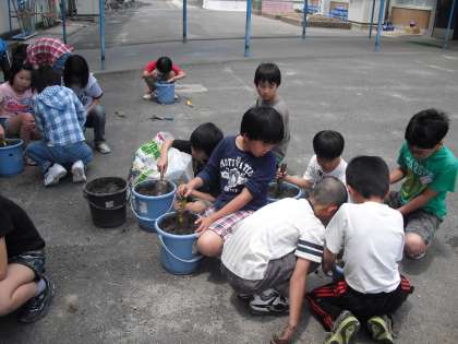 今日はバケツ稲を育てるための土作りをしました。土に肥料をまぜて、水を入れて出来あがりです。後はちゃんと種モミが芽を出してくれるのを待つばかりです!