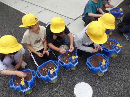生活科「さいてほしいな わたしのはな」の学習で、一人ずつあさがおの種をまきました。「どんな花が咲くかな」「大きくなってほしいな」とわくわくした顔で、植木鉢に土を入れ、種をまき、お水をあげていました。自分であさがおに名前をつけたので、これから毎日お水をあげ、大切に育ててほしいなと思います。