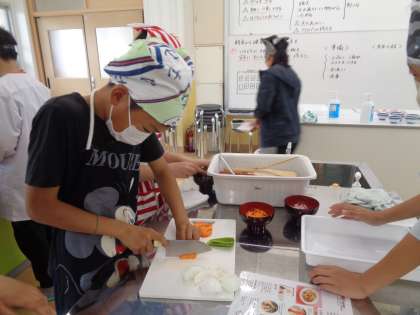 家庭科の学習では、栄養バランスのいい朝ごはんのおかずとして、にんじんやピーマン、玉ねぎ、ハムを使った「いろどりいため」を作りました。ふだん野菜があまり好きではない子ども達も「おいしい!!」と感動して食べていました。班で協力して安全に手際よくおいしいおかずを作ることができました。