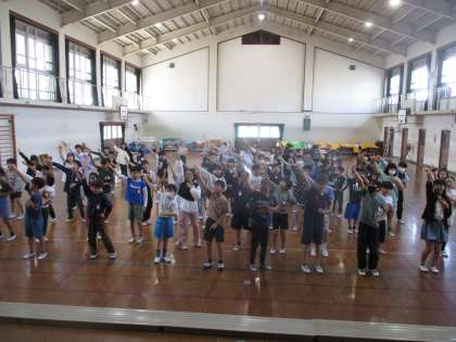花背山の家の宿泊学習から帰ってきて、すぐに練習を始めた5年生の子どもたち。練習時間は短かったですが、1年生の入学をお祝いしようと一生懸命ダンスを覚えました。今日は大成功。セリフもダンスもバッチリでした。