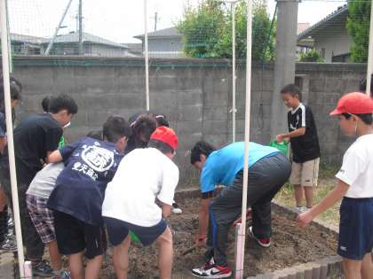 5月21日にみんなで植えたお米の苗が思うように生長せず、再度土づくりから始めることになりました。今日の主役は担任の先生がた。苗は枯れてしまいましたが、心は枯れていません!「今度こそ、大きく生長させるぞ!!」懺悔の土づくりでした・・・。