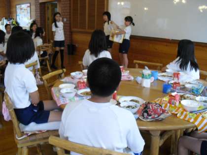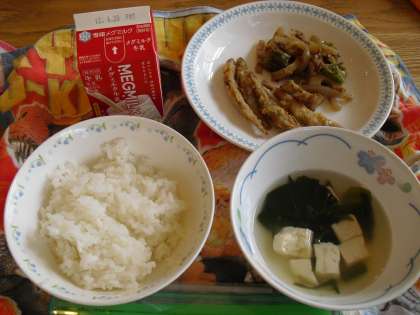 食の学習,ランチルームは5年3組。香ばしい,わかさぎや伏見とうがらし,すまし汁,米飯まで残さず完食,ペロリ賞でした。