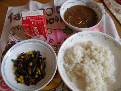 今日の給食は,麦ごはん・牛乳・カレー・ひじきのソティでした。