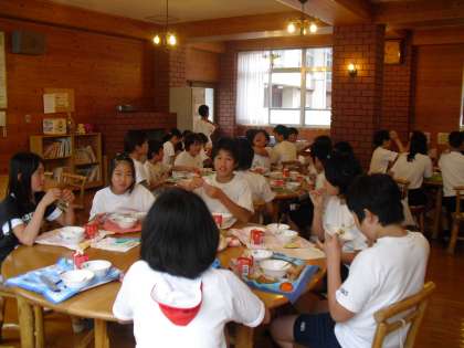 地産地消の献立として,万願寺とうがらしを使用しています。万願寺とうがらしとなすを食べやすい大きさに切り,油で素揚げし,かつおだしで煮てあんかけにしています。少し大人向きの献立のようですが,どの学年の子どもたちも,ごはんにかけてモリモリとおいしく食べていました。