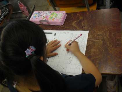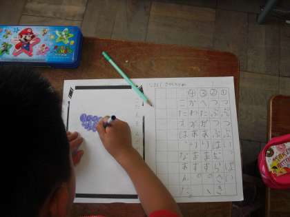 今日の国語は「なぞなぞあそび」です。「〜は」で使われる助詞の「は」を使った文章をつくり、なぞなぞを完成させていきました。「わ」と「は」の違いに戸惑いながら、みんながんばってなぞなぞをつくっていました。
