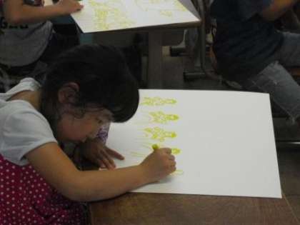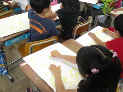 図工の時間に「絵をかこう」の学習をしました。今日は黄色のパスだけをつかって、運動場で遊んでいる絵をかいていきました。次は、花や木の緑をいれて、いろいろな色をつけて絵を仕上げていきます。どんな作品ができるかな?