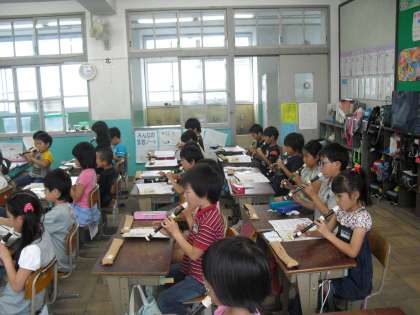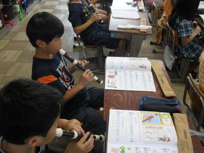 今日の音楽は、子どもたちが大好きなリコーダーを使っての学習です。今日は「シ」と「ラ」の音を練習しました。小さい指で必死に穴をおさえながら、きれいな音を出せるようにがんばりました。早く高学年のお兄ちゃん、お姉ちゃんのようにきれいな曲がふけるようになるといいですね。