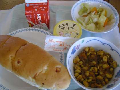 今日の給食は,チーズコッペパン・牛乳・チリコンカーン・野菜のホットマリネ・プリンでした。食の学習・ランチルーム給食は6年3組の子どもたち。小学校入学当初は野菜や大豆,牛乳などに四苦八苦していた子どもたちも今では難なくパクパクモリモリと気持ちいいほどの食欲。子どもたちの食べている姿や食事を楽しもうという姿勢に成長を感じます。