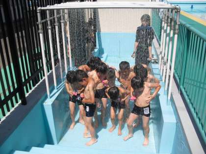 今日から「水あそび」の授業が始まりました。1年ぶりのプールに、みんな大興奮!腰洗いそうにしっかりつかって、地獄のシャワーも無事通過です!
