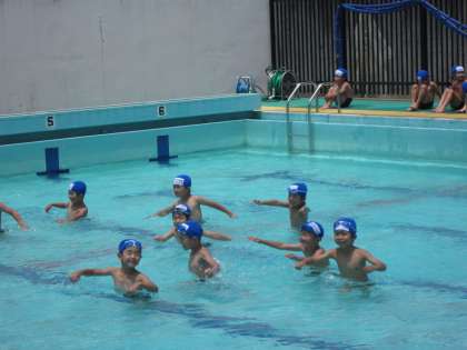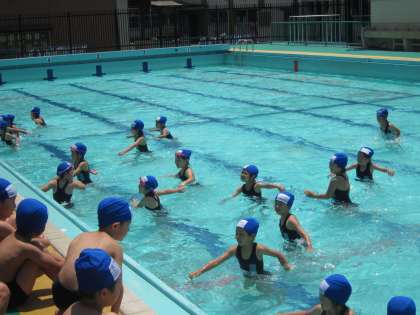 1年生は、小学校に入っての初プールです。今まで幼稚園や保育園で入っていたプールより大きなプールにみんな大喜び!先生の言っていることをよ〜く聞きながら、楽しく水あそびを進めることができました。