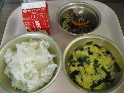 今日の給食はごはん・牛乳・プルコギ・わかめスープでした。色鮮やかなピーマンやにんじんと牛肉を炒めたスタミナ満点の韓国・朝鮮の料理です。