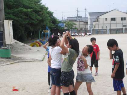 次は、いよいよ光電池を使っての実験です。みんなで太陽にむけて光電池をあて、モーターを回してみました。ちょっとでもよく当たるように、太陽にむかって手を大きく伸ばしたり、太陽に少しでも近付こうと(?)運動場の壁の方にむかっていったりするなど、子どもなりにいっぱい考えて、工夫していました!