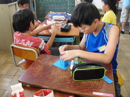 給食委員会では,返却時の当番活動のほか,牛乳パックのたたみ方指導で教室を回ったりしていますが,月曜日の委員会の時間には,牛乳パックのリサイクルで「小物入れ」をつくりました。牛乳パックをカットして重ね合わせ,画用紙などで飾り付けをして世界に一つだけのすてきな「小物入れ」ができましたよ。