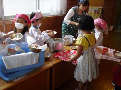 食の学習・ランチルーム給食は1年2組。「あじみつけ」の学習のあとランチルームへ移動し,レストランでの給食を楽しみました。麦ごはんやゴーヤ,とら豆など様々な食感とかくれた味をみつけようとひと口30回,飲み込まないように大事に大事に噛んで味わっていました。