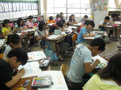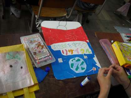 今日は、単元の学習のまとめとして、ポスターを作成しました。ごみを減らしたり、リサイクルを呼びかけたりする内容をポスターにしています。色鉛筆やマジックで色をつけたり、色紙をちぎってはったりするなど思い思いの工夫しながらポスターを作っていました。