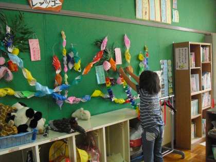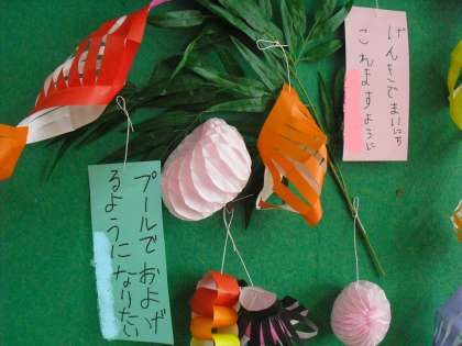 先日からつくっていた七夕のかざりができあがりました。リングのかざりもちゃんと虹色につなげていきました。もちろん願い事もちゃんとかざりました。願いがかなうといいね!