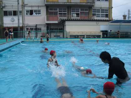 4年生の水泳では、まずしっかり浮くことから始め、今では時間の前半に、自分ができる泳ぎ方でより長く泳いだり速く泳いだりすることに挑戦し(ねらい1)、後半には、少しがんばればできそうな泳ぎ方に挑戦しています(ねらい2)。水中で、しっかり息を吐くことを心がけ、多くの子どもたちが、息継ぎを上手にしながら泳ぐことができるようになっています。これなら検定がたのしみですね。がんばりましょう!