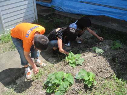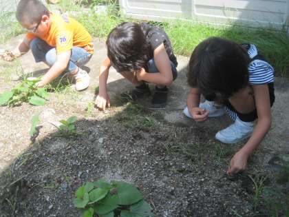たんぽのみんなは、学校の畑にさつまいもを植えています。今日は、ちょっとまわりに生えてきた雑草を抜きました。雑草を抜いた後は、水もたっぷりあげました。そらまめを収穫した時のような大きなさつまいもになったらいいのにね!