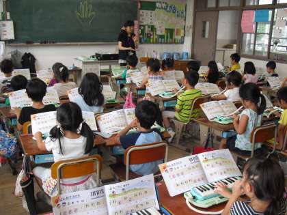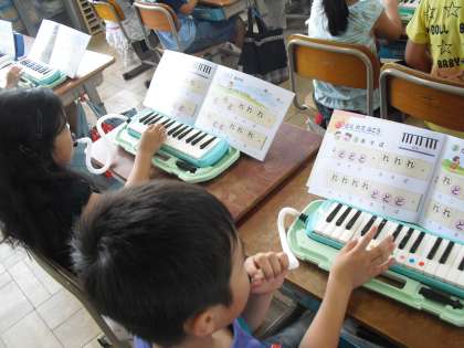 音楽の時間に、けんばんハーモニカをつかって学習をしました。今日はタンギングの練習です。先生のリズムに合わせて「ド」や「レ」の音をみんなで合わせてふきました。