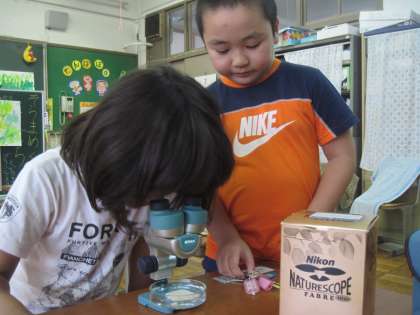 保護者の方が持ってきてくださっためだかのたまごを観察しました。顕微鏡でのぞいてみると、目玉のような黒い点々が・・・。生命の神秘を感じさせる、とっても貴重な体験でした!