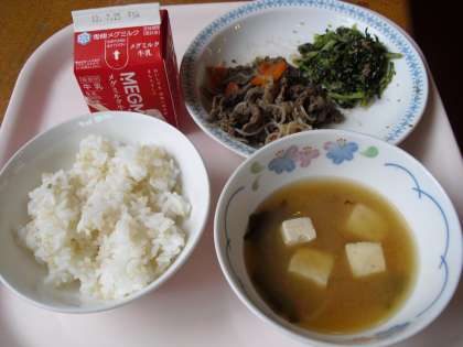 今日の給食は,玄米ご飯・牛乳・牛肉のしぐれ煮・だいこん葉のごまいため・みそ汁でした。みそ汁のみそは,地産地消,京北みそをつかっており,やさしいあまさが玄米ご飯のぷちぷちした食感と合わさり口の中に広がりました。