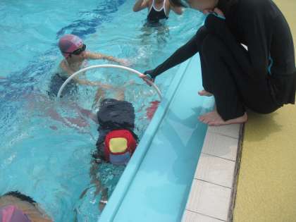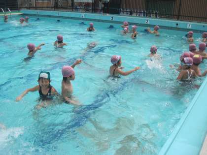 今日は2年生と一緒に水泳(水あそび)をしました。水の中にもぐったり、浮いたりしながらいろいろな水あそびを楽しみました。流れにのりながら、フープをくぐったりすることもできました。