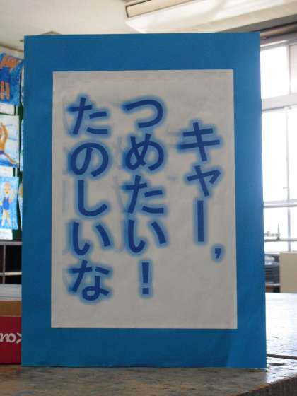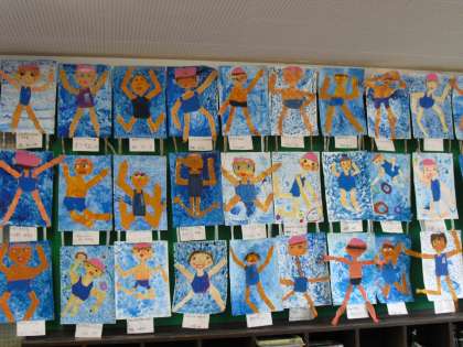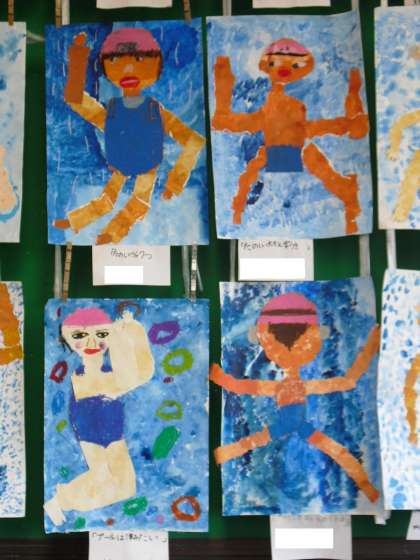 2年生の作品は「キャー,つめたい!たのしいな」です。楽しいプールの様子を絵にしました。