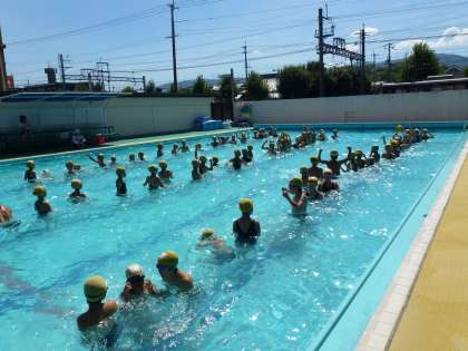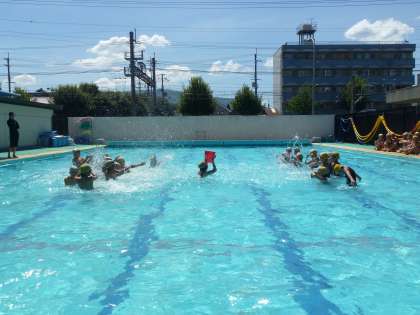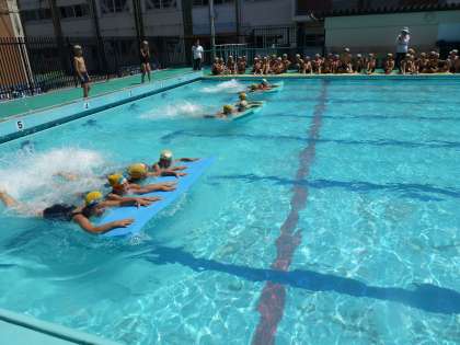 今日は水泳大会がありました。種目はリレー(ロングビート板・25m走・自由形・人間みこし)とバケツ大会とボール送りです。みんなで仲よく6年間の水泳学習を締めくくりました!!