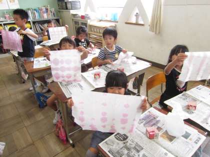 和紙を広げた瞬間の模様の美しさにみんな大喜び!みんな自慢げに出来あがった作品を見せあっていました!