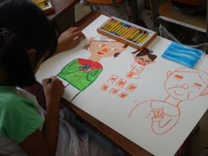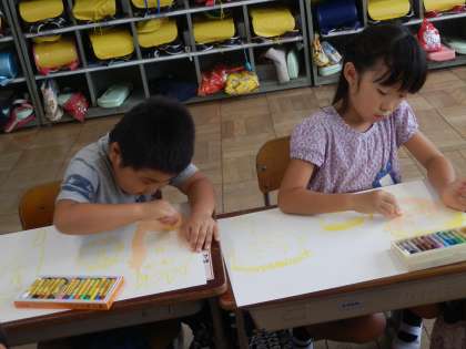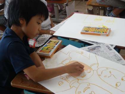 図工の時間に、おじいちゃん・おばあちゃんの絵を描きました。パスを使って、みんなで一生懸命描きました。大好きなおじいちゃんやおばあちゃんの絵を描くとあって、いつもより熱心に描いているところが、とってもかわいかったです!!