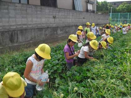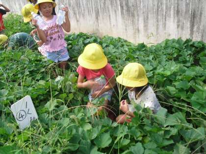 さつまいもを植えている畑に行きました。今年の夏は、よく雨が降ったので、どの苗もとっても大きく育っていました。雑草とさつまいもの葉っぱに囲まれながら、しっかり水やりをしてきました。