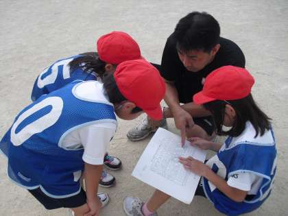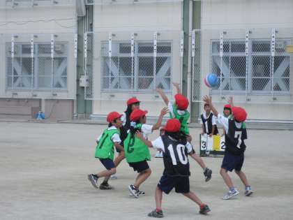 2年生の体育は「パスゲーム」です。ルールを守りながら、攻め方、守り方をそれぞれに工夫して、ゲームを楽しんでいます。準備や後片付けだけでなく、ゲームの運営も全部自分たちでできます!