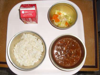今日の献立は、麦ごはん、ハッシュドビーフ、野菜のホットマリネ、牛乳です。ハッシュドビーフはバターにバーベキューソース、ウスターソース、塩、こしょう、こいくちしょうゆ、ローリエが絶妙な配合で調理され、とっても美味しく出来あがっています。