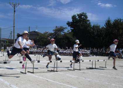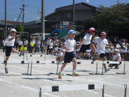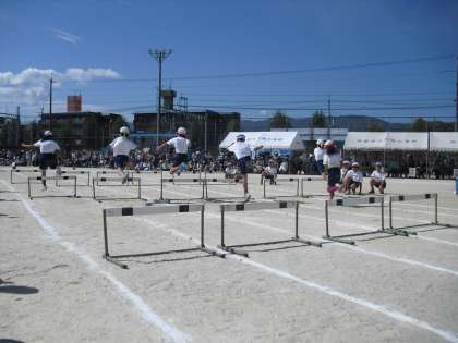 4年生のハードル走です。自分にあったインターバルのハードルを、「トン・1・2・3」のりズムを意識して、ゴールを目指しました!!