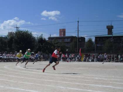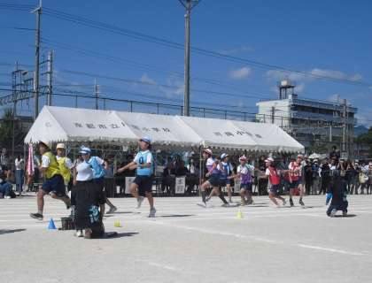 6年生のリレーです。仲間を信じてつなぐバトンパス。ともに遊び、ともに学んだ仲間だから、できたリレーです!!