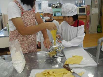 手打ちパスタをみんなでつくりました。初めて使うパスタマシーンに、みんな大喜び!!