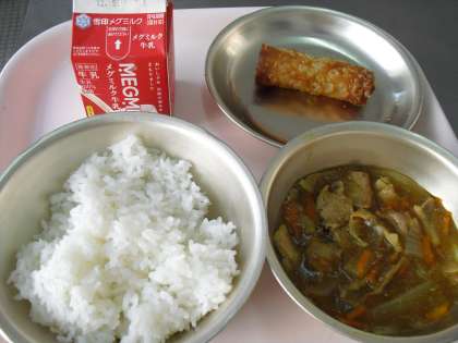 今日の給食は,カレーあんかけごはん・牛乳・春巻でした。