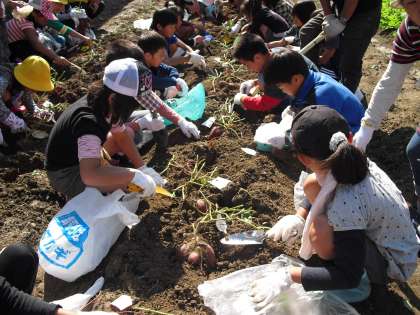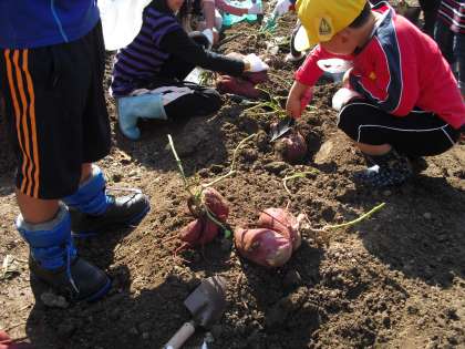 10月20日(土)少年補導主催のさつま芋掘が行われました。長靴をはき,手袋をつけ,スコップを持って,目指すはさつま芋。土が思っているより硬く,悪戦苦闘でしたが,スコップを持った少年補導のおじさんが土を少し起こしてくれました。その続きを掘ると,土の恵みをいっぱい吸収したさつま芋が出てきました。あまりの大きさにビックリ!