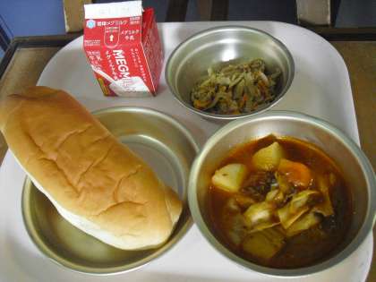 今日の給食は,ミルクコッペパン・牛乳・ボルシチ・ごぼうのソティでした。