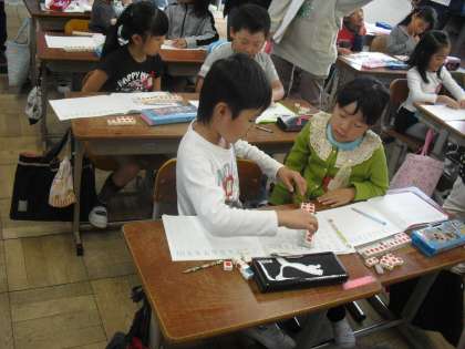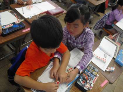 今日は1年1組で研究授業がありました。たくさんの先生に囲まれながらも全く緊張しない1年生。緊張どころか大張りきりの1時間でした。繰り上がりのある足し算は、まず10のまとまりを作るんですよね。足す数を上手くさくらんぼで分けてくださいね!