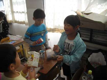 自分たちで作った手作り楽器を使って、リズムあそびをしました。友達がたたいたリズムに合わせて、楽器でリズムをうってみました。同じリズムでも、いろいろな音が聞こえてきて、楽しかったね!